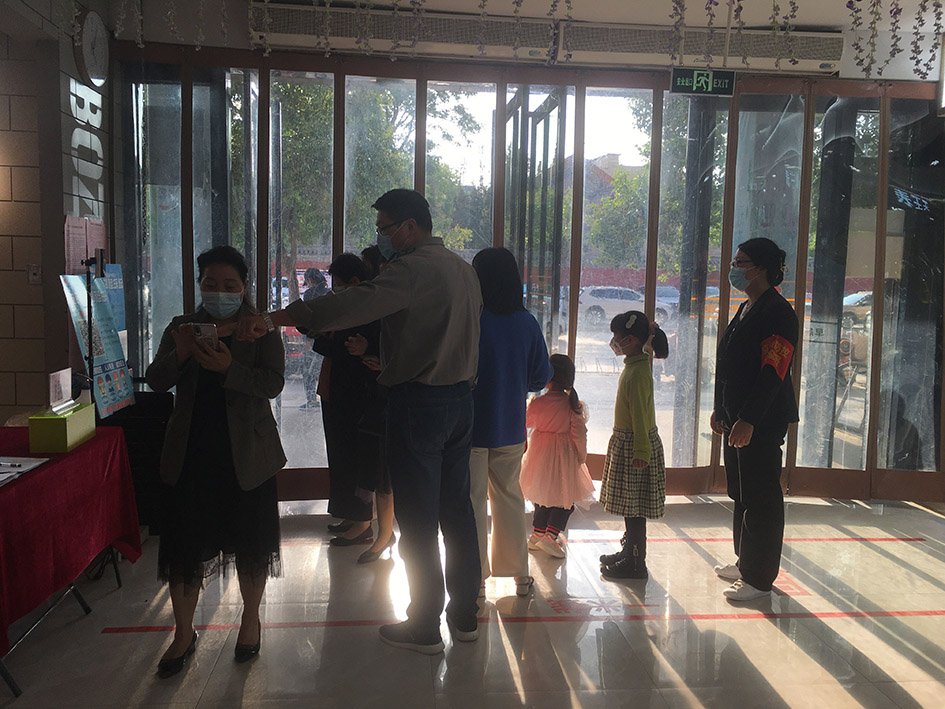 “五一”當(dāng)天,商場客流增多,服務(wù)保障部門堅守“一小時輪崗”制度,同安保人員對進店顧客進行測溫、驗雙碼、提醒規(guī)范佩戴口罩工作。