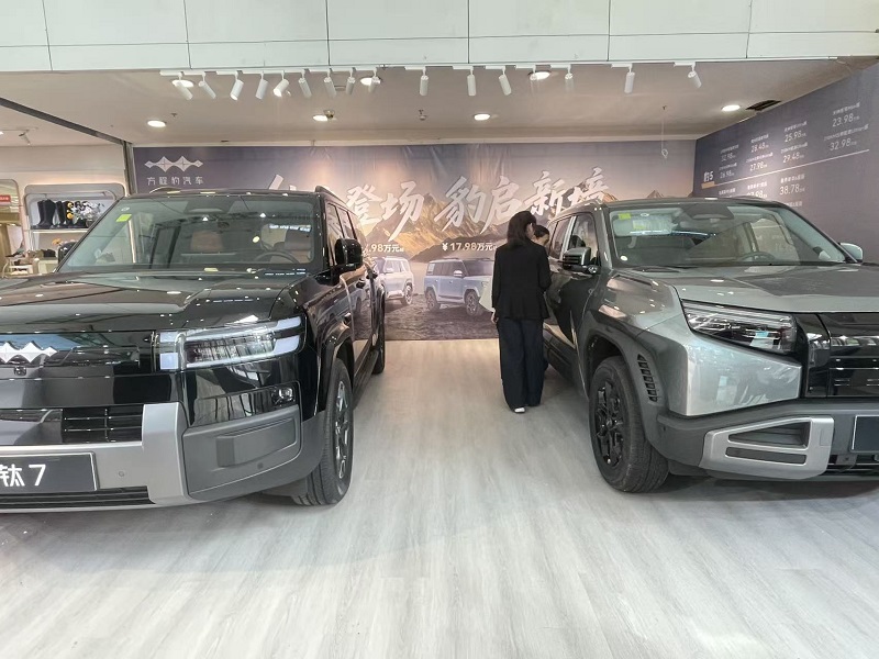 現(xiàn)場展臺設(shè)計(jì)別具匠心,以大氣的山水景觀為背景,搭配清晰醒目的品牌標(biāo)識,營造出雅致且專業(yè)的展示氛圍。本次車站重點(diǎn)呈現(xiàn)了方程豹“豹8”“鈦7”等熱門車型,其中,售價(jià)定格在17.98萬-21.98萬元區(qū)間的鈦7車型,憑借硬朗大氣的外觀設(shè)計(jì)與明確的越野定位,成功吸引了眾多市民駐足觀賞、咨詢。為提升消費(fèi)者體驗(yàn),展車旁特別設(shè)置了專屬洽談區(qū),便于市民近距離深入了解車型配置詳情及最新購車政策。